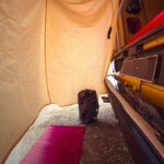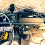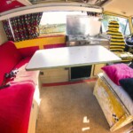 A l’intérieur ce van bénéficie de quelques particularités d’origine plutôt rares : des vitres levantes isolées, un canapé d’angle d’origine très convivial plus les habituels meubles Westfalia en placage bois. Tout l’équipement d’époque modernisé avec par exemple un frigo électrique, un panneau solaire et des rideaux isolants et occultant.